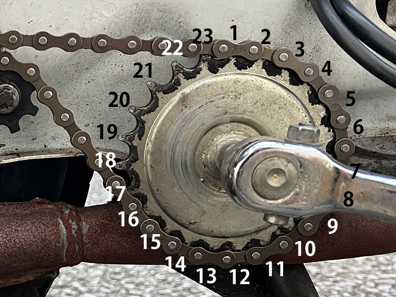 偶数から奇数に歯落ちしているのでこのままではいくら調整をしてもチェーンの長さが合いません。